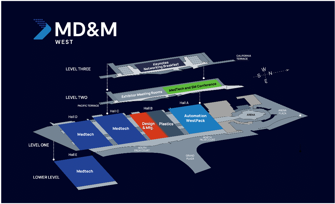 The MD&M West 2026 floor plan is organised to help attendees move logically across the manufacturing lifecycle. At a glance, the floor plan divides the expo by levels and themed halls.